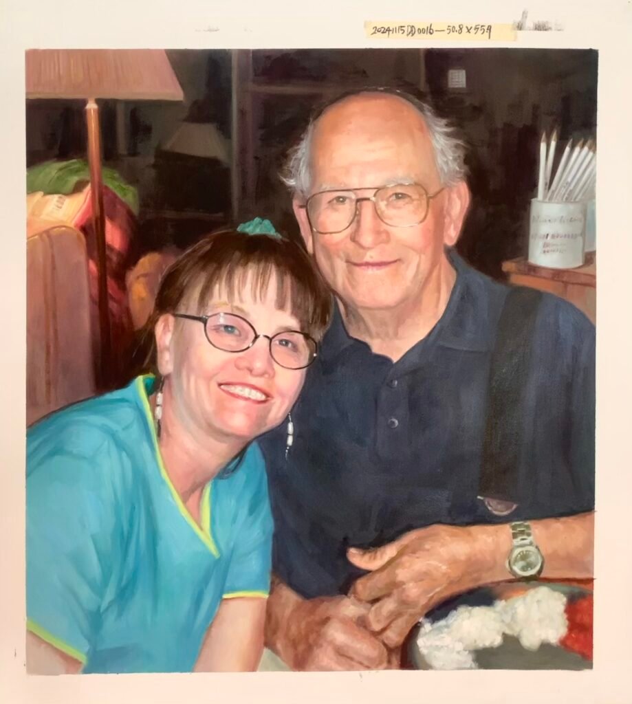 This portrait was commissioned after the client lost her husband. We restored an old photograph and carefully adjusted lighting and tones to recreate a warm moment they once shared together. The goal was not perfection, but familiarity — so the painting would feel like a presence rather than a picture.